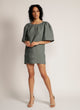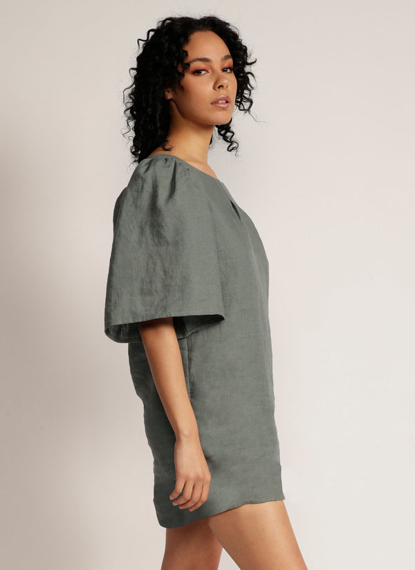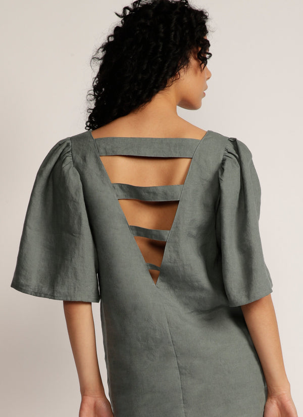 This mini shift dress is business in the front and party in the back. Made from 100% linen, heads will turn when people get a glimpse of the cut out detail on the back. With oversized butterfly, elbow length sleeves, this fully lined dress is sure to bring the drama.