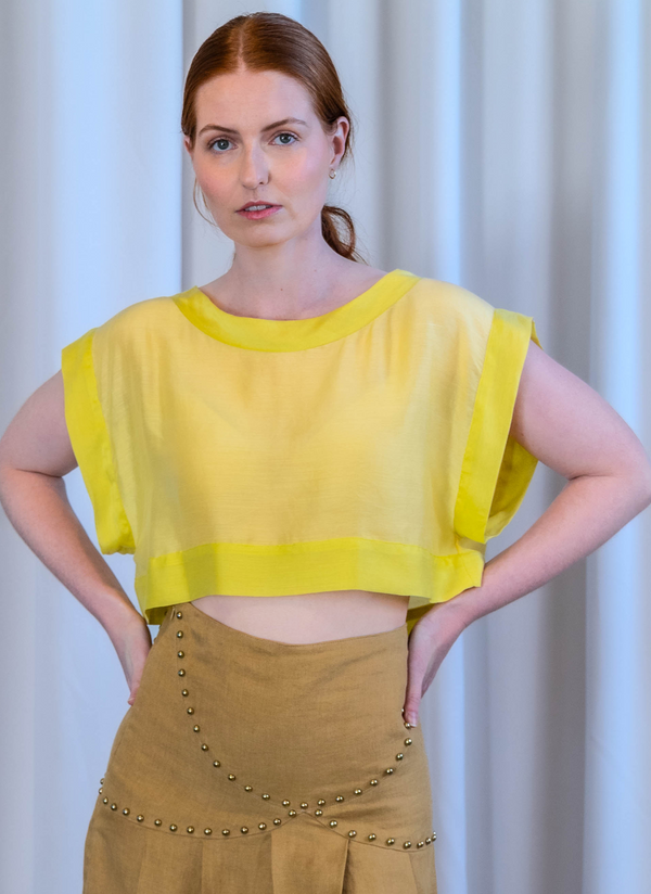 The Candy Pitch top is from our Cirque Rouille collection. This cropped 100% banana silk top is dyed inhouse using natural plant based dyes and features a boat neck with oversized kimono style sleeves.
