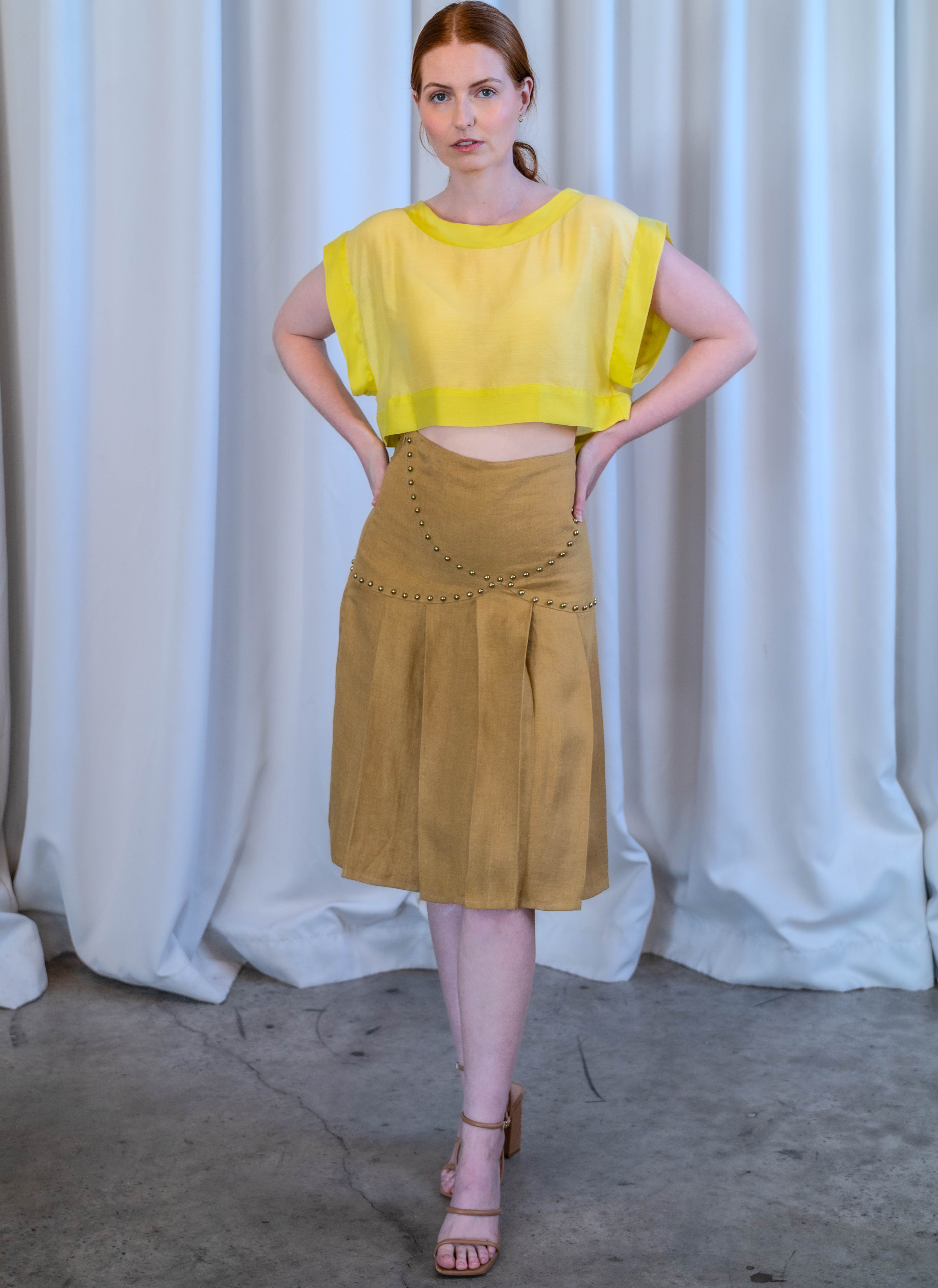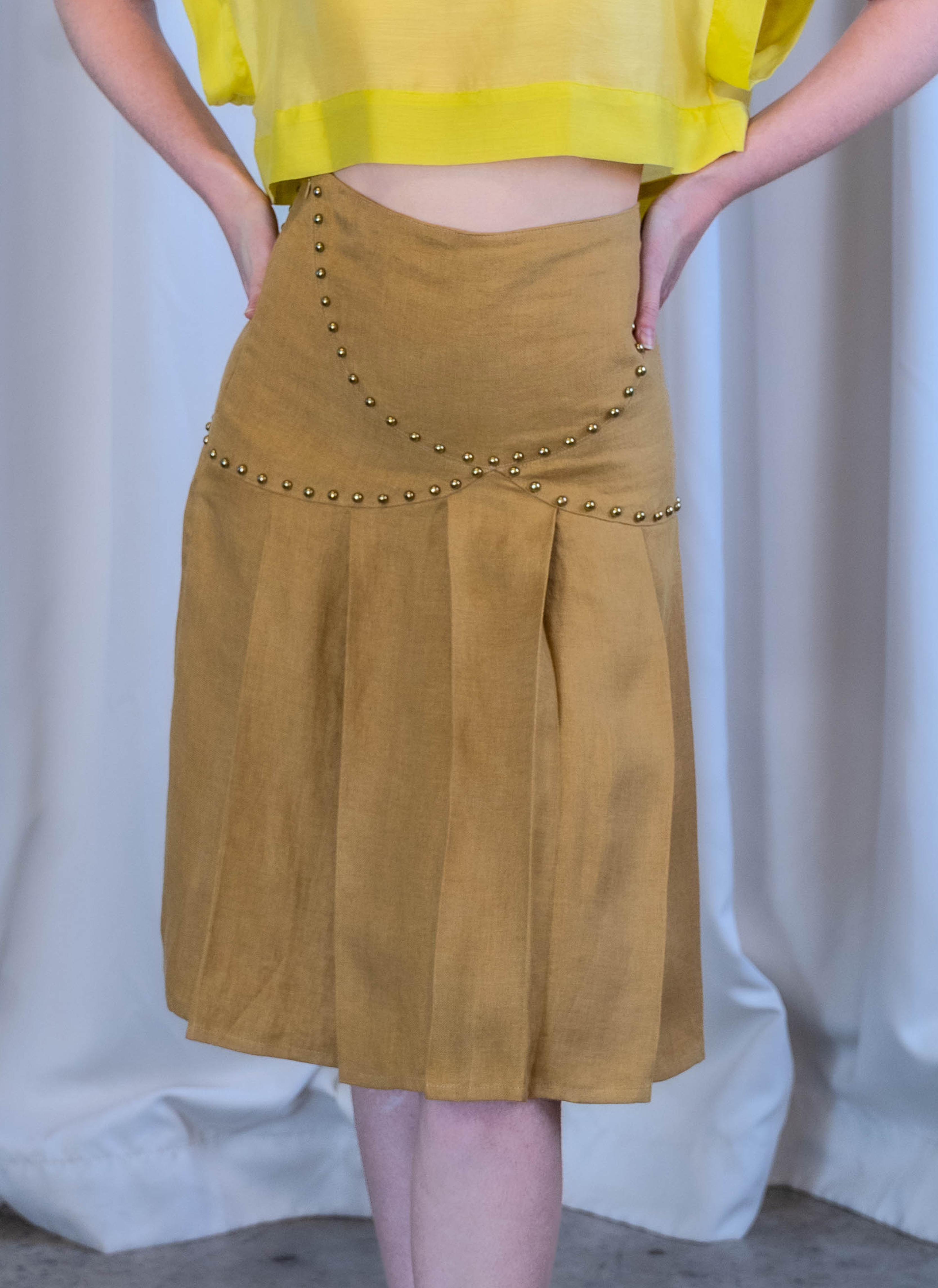 The Menage skirt is from our Cirque Rouille collection. Made from 100% linen, this below the knee, pleated skirt features a fitted yoke adorned with studs.