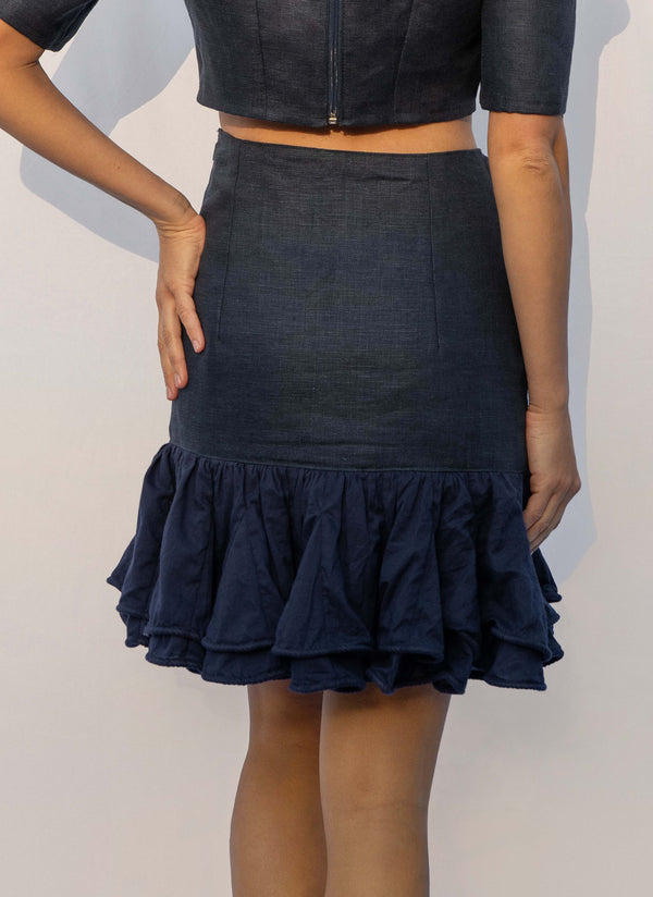 The Starboard skirt is from our Saffron Seas collection. This 100% linen rushed asymmetrical skirt features double ruffles with roped hem detail.