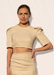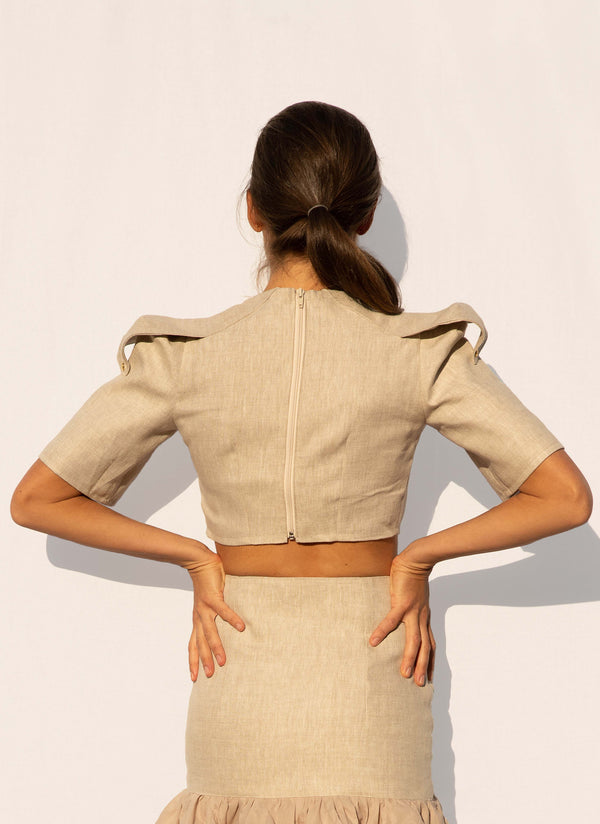 The Leeward top is from our Saffron Seas collection. Made from 100% linen, this cropped top features structured sleeves with epaulettes that are buttoned down with a gold metal button.
