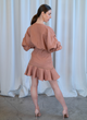 The Calliope dress is from our Cirque Rouille collection. Made from 100% linen, this mini dress with a cinched waist features batwing sleeves, extra long cuffs and a curved hem adorned with studs.